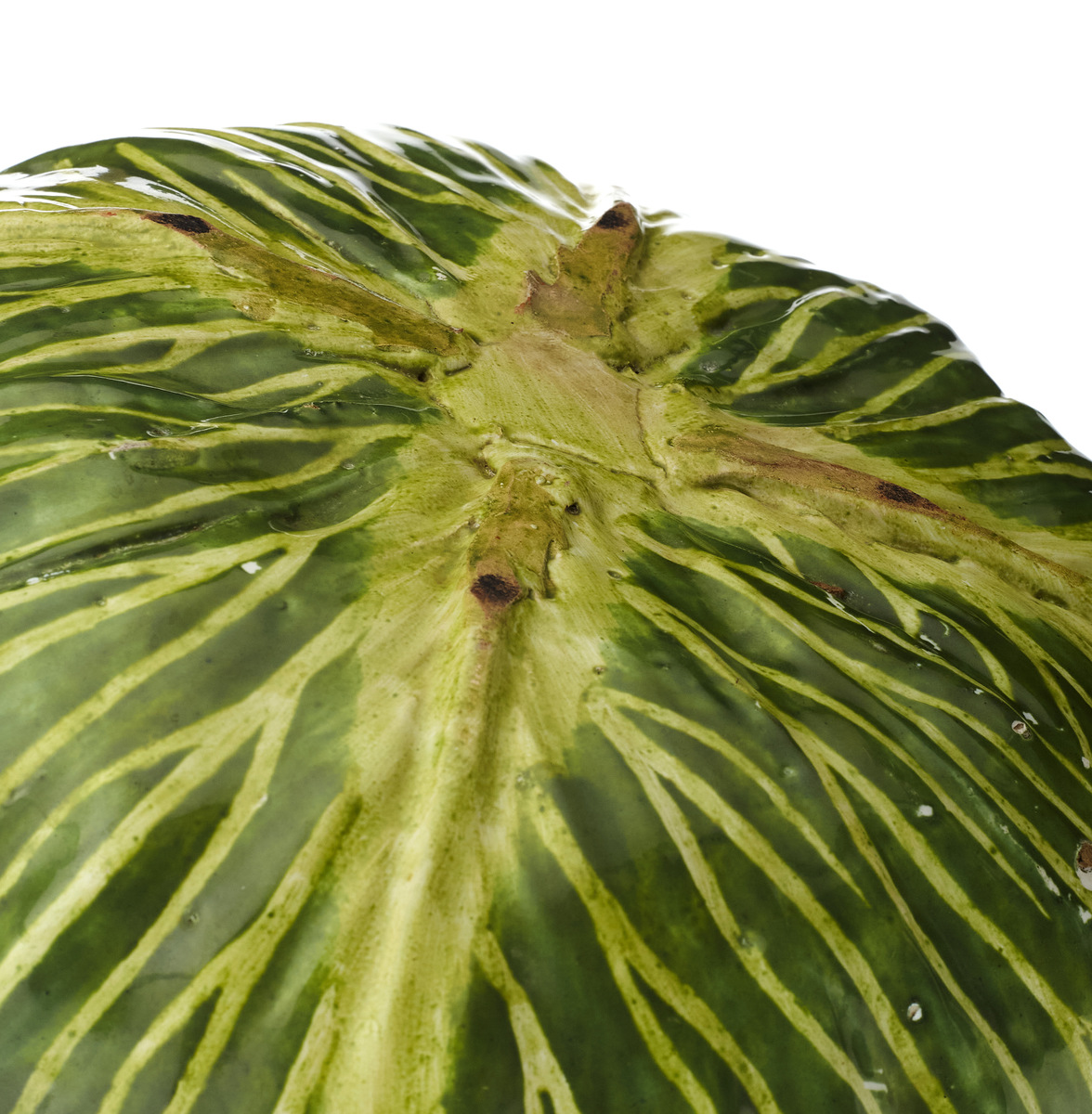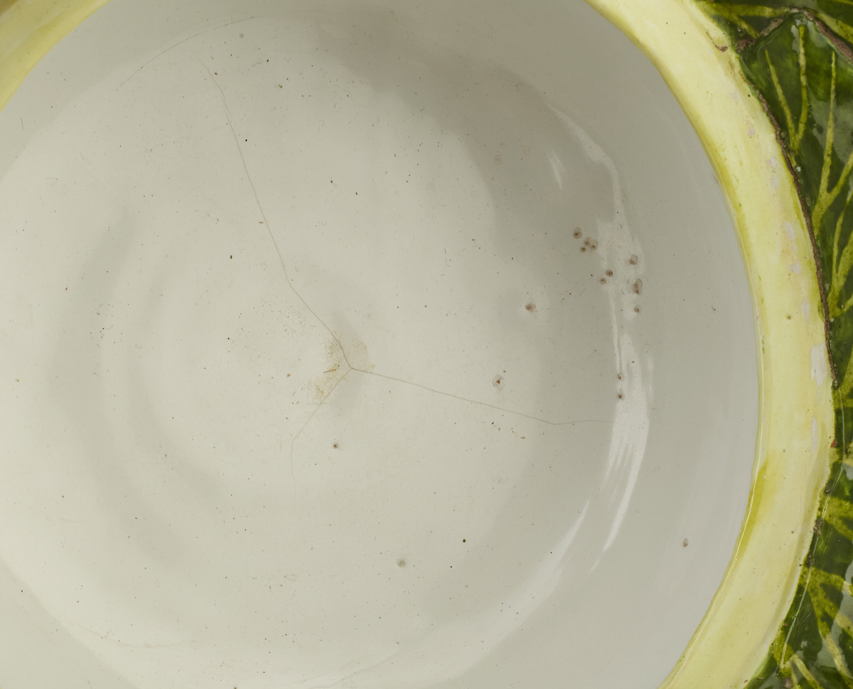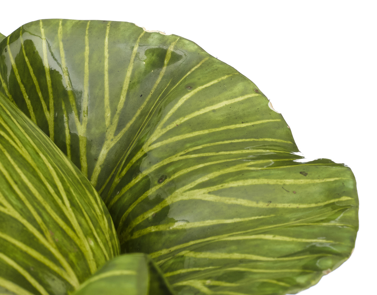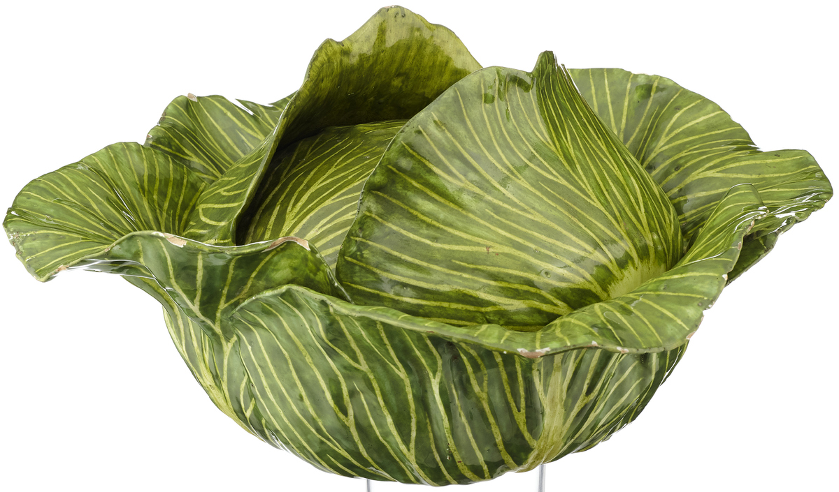 Strassburg, 1750 – 1754. Paul Hannong . Fayence in Form eines grossen Kohlkopfs. Herzblätter als Deckel. Grüne Bemalung mit gelb-grünen Rippen. Alters- und Gebrauchsspuren, Glasurriss.