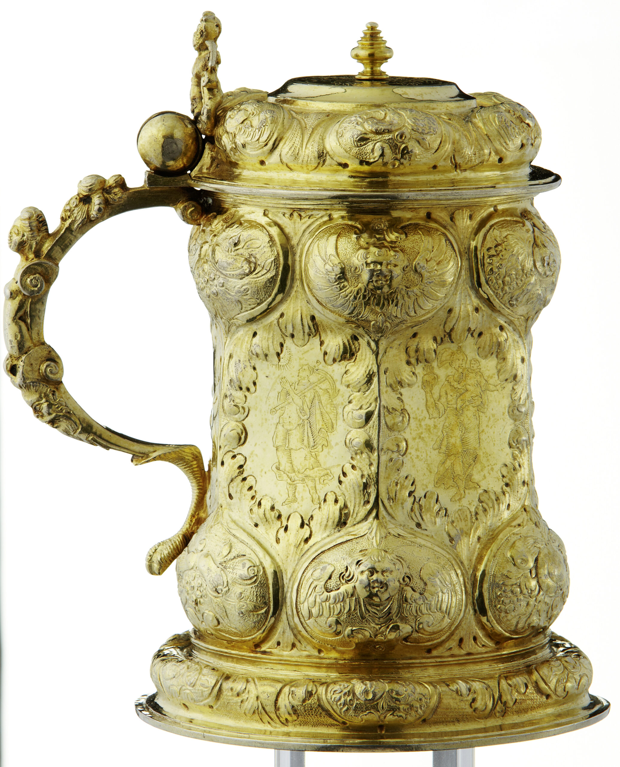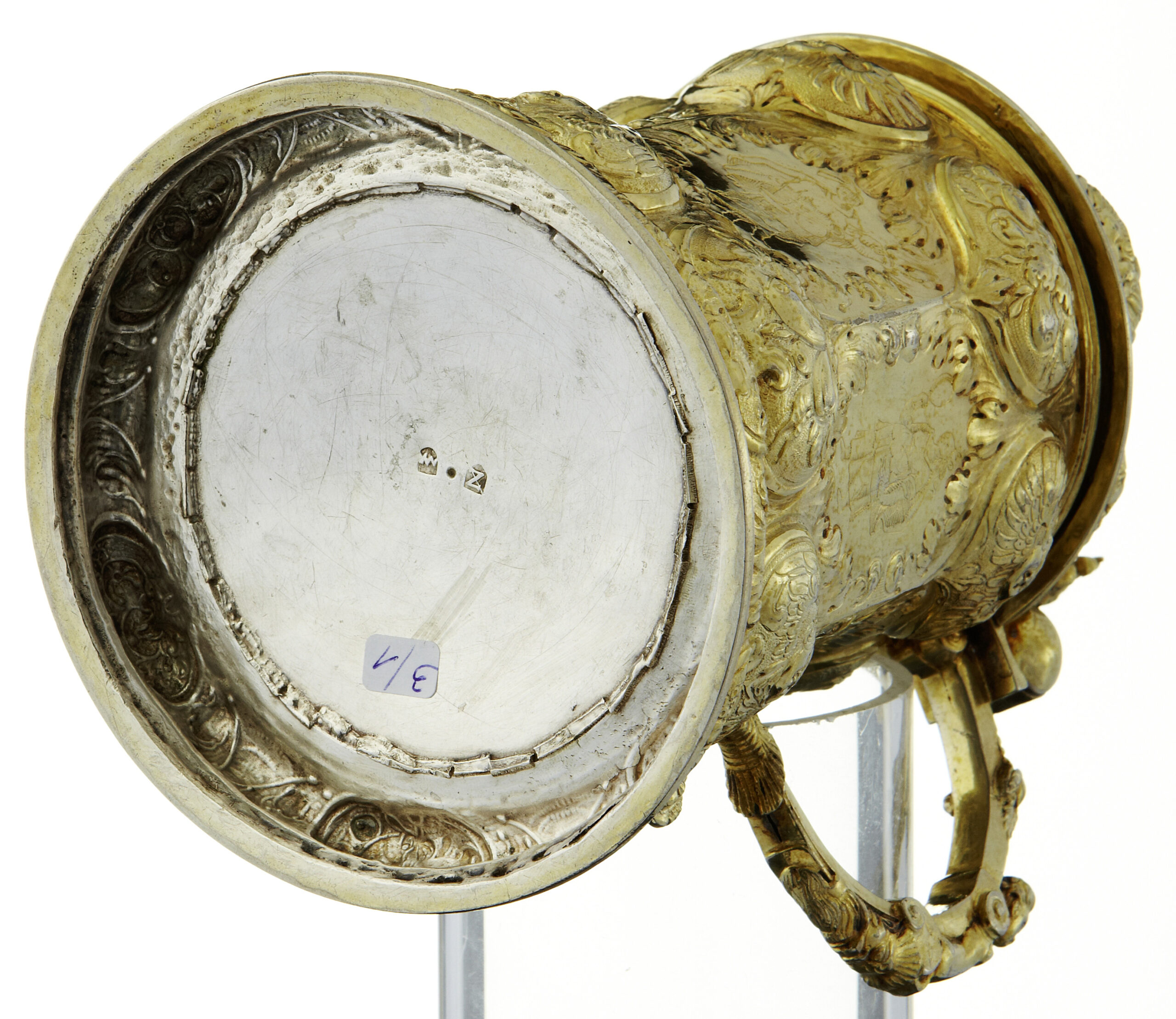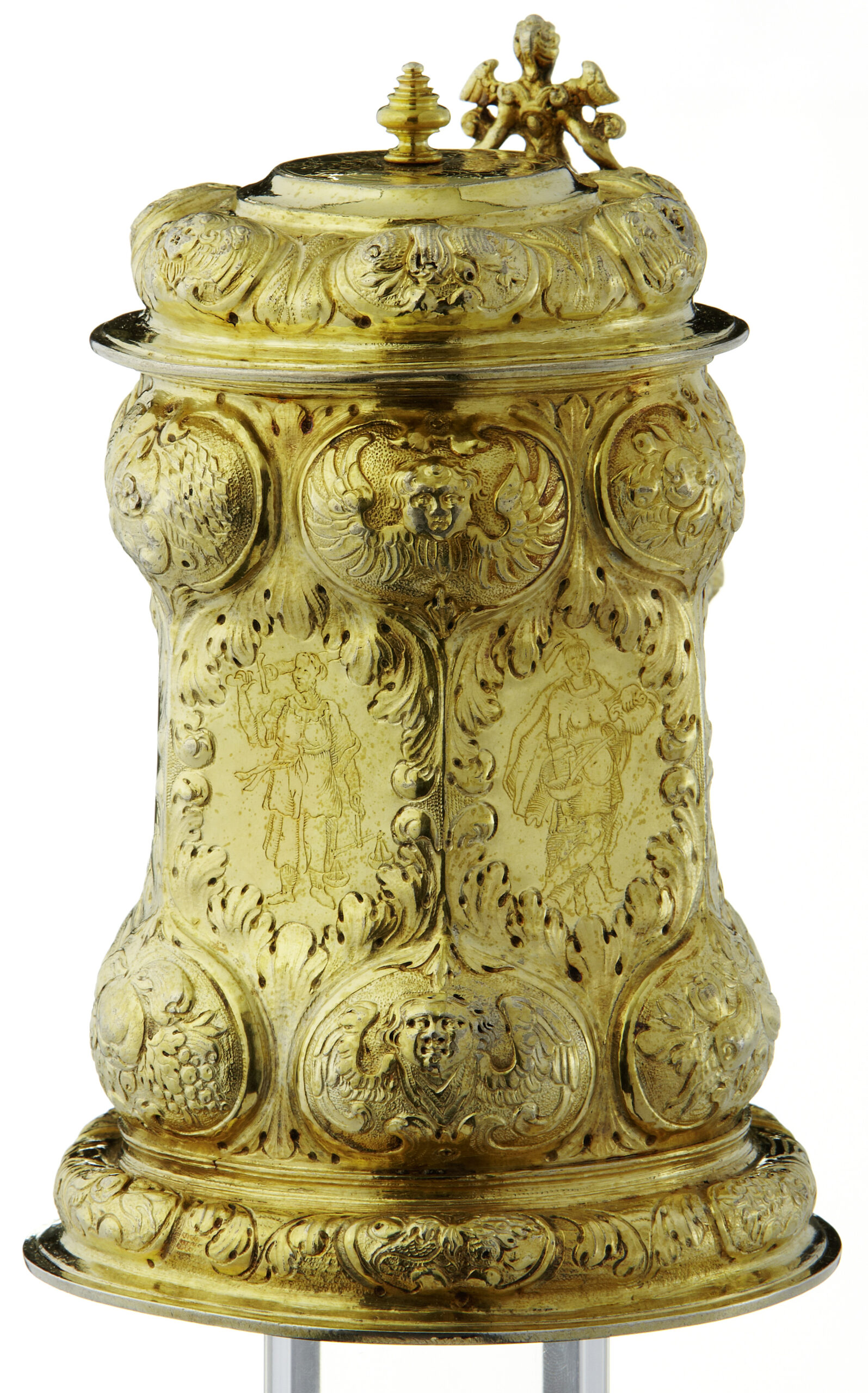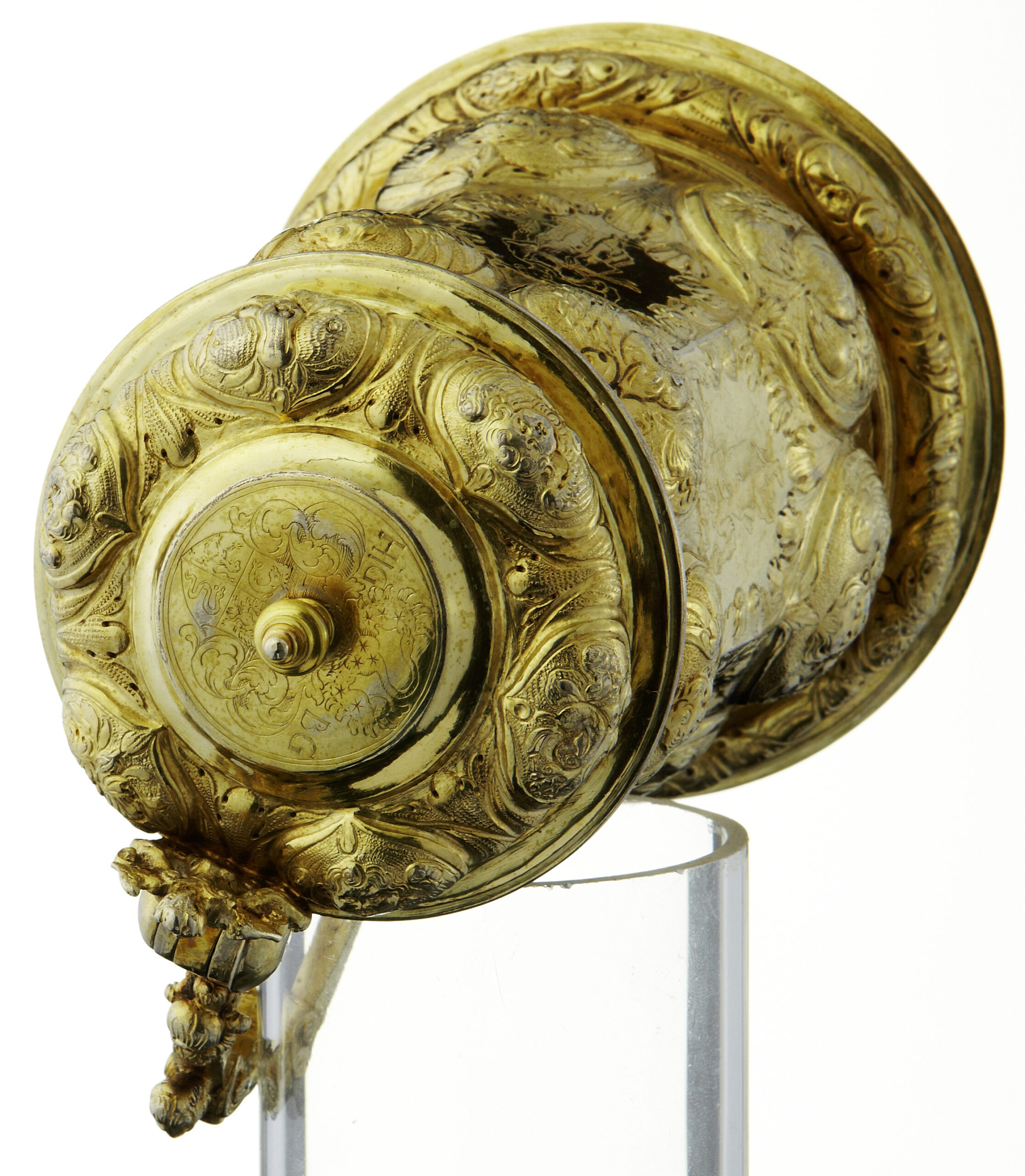 Zürich um 1660. Meistermarke Hans Caspar Ulmer. Silber getrieben, gegossen, ziseliert, graviert, aussen und innen vergoldet. Facettierte Wandung mit sechs gravierten, allegorischen Darstellungen der Tugenden zwischen Buckelreihen mit ziselierten Puttenköpfen und Fruchtbündeln. Scharnierdeckel mit Daumenrast in Form einer männlichen Herme. Auf dem Scharnierdeckel graviertes Wappen der Zürcher Familie Gessner. Gebrauchsspuren.