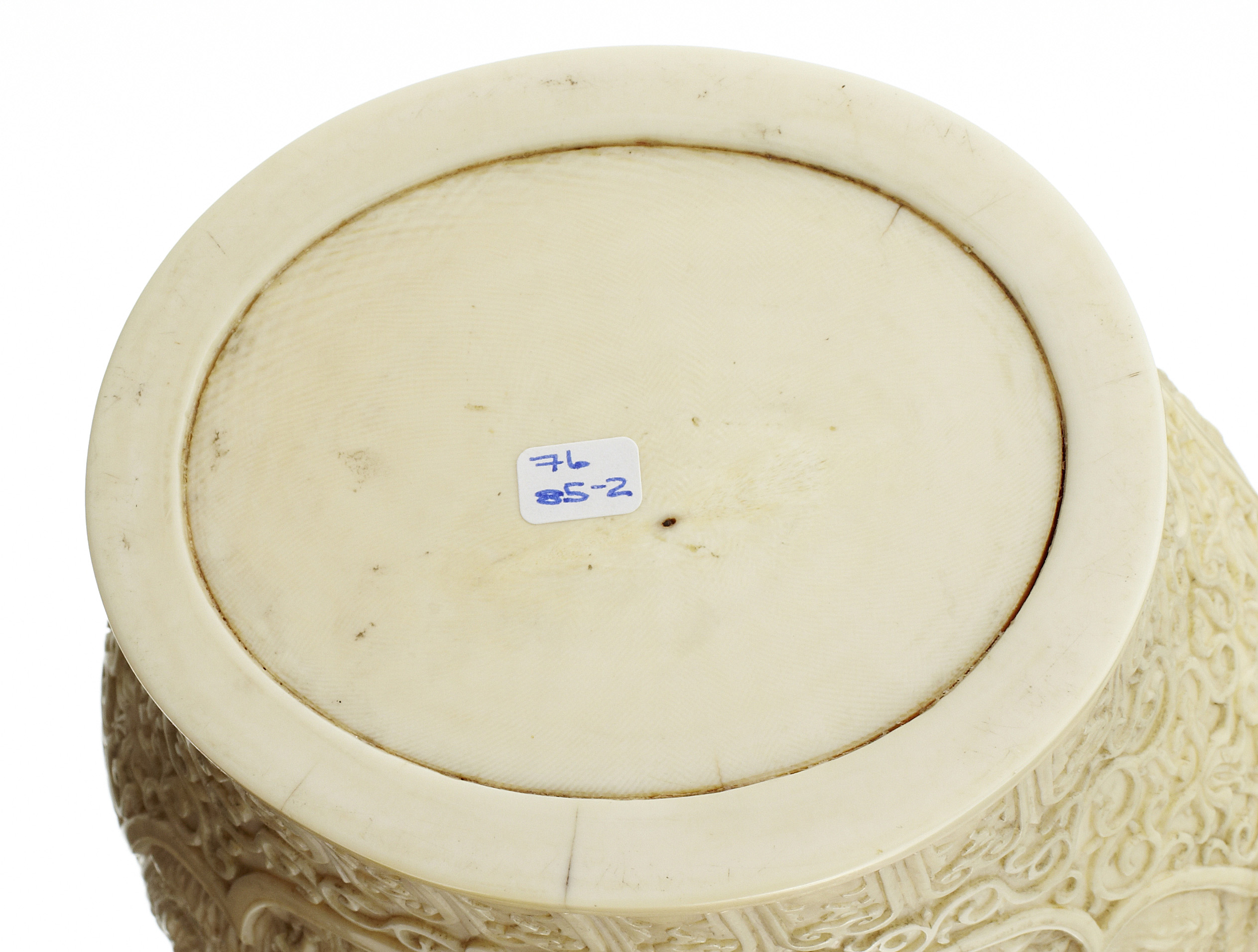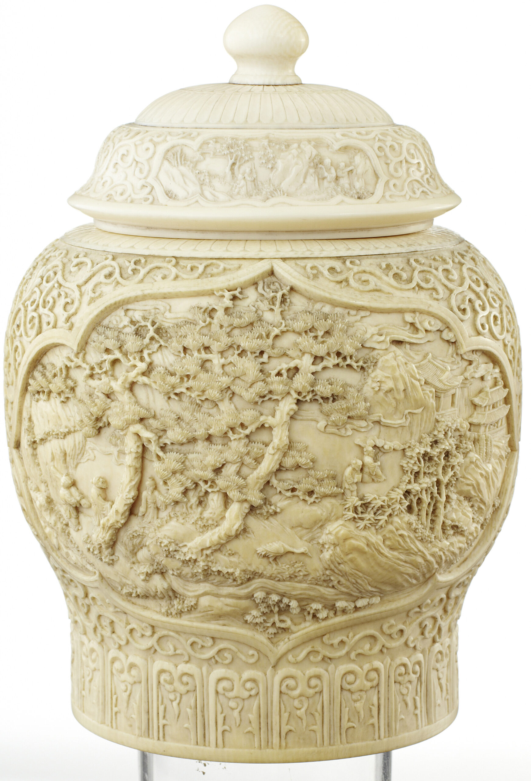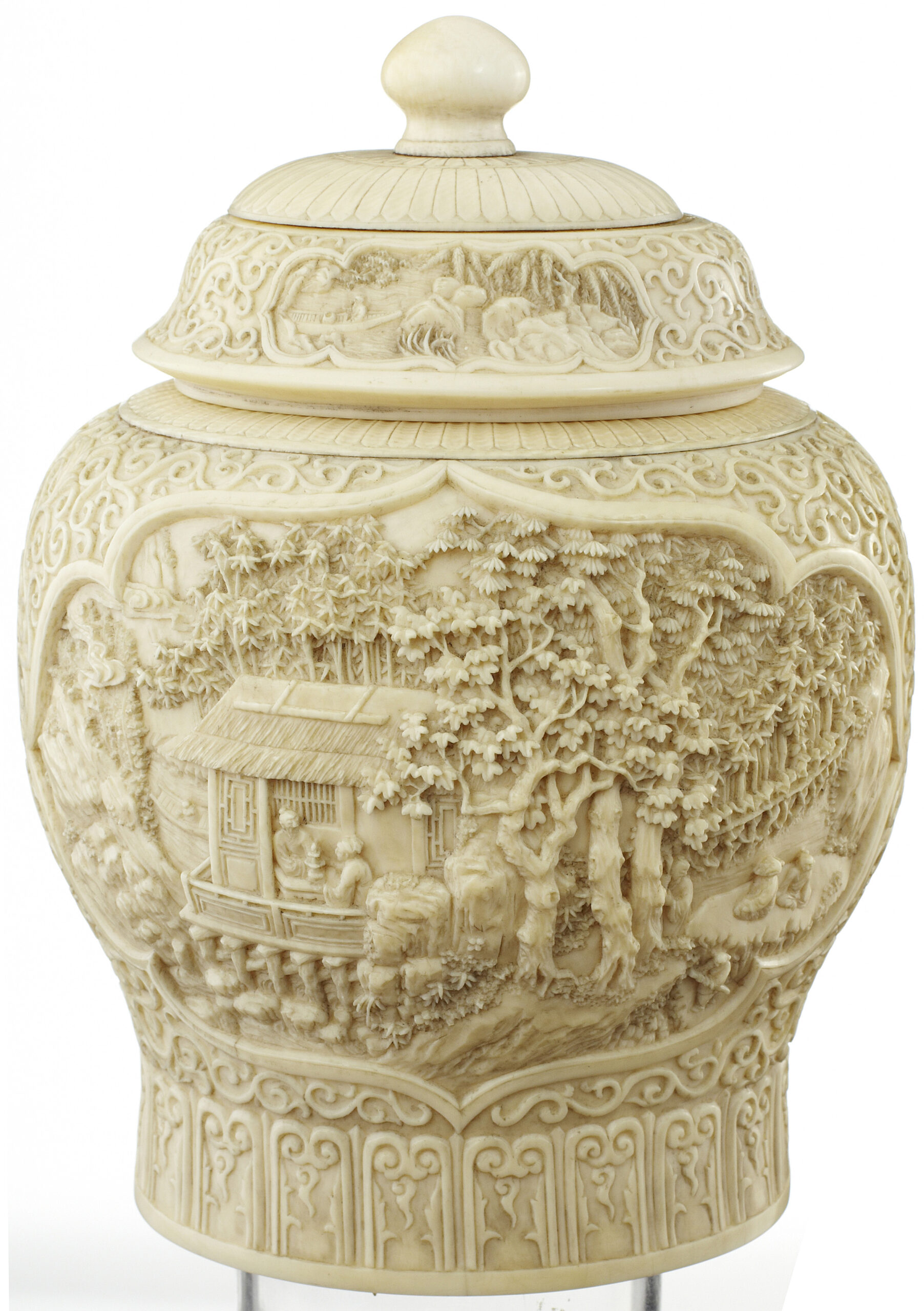 China 18./19. Jh. Unterschiedlich beschnitzt aus massivem Elfenbein. Jede Vase mit zwei grossen “Ruyikopf”-förmigen Kartuschen mit detailliert ausgeführtem Reliefdekor von Figuren in Landschaften, dazwischen Rankendekor. Die Deckel mit rundem Knauf und kleinen Landschafts-Kartuschen.