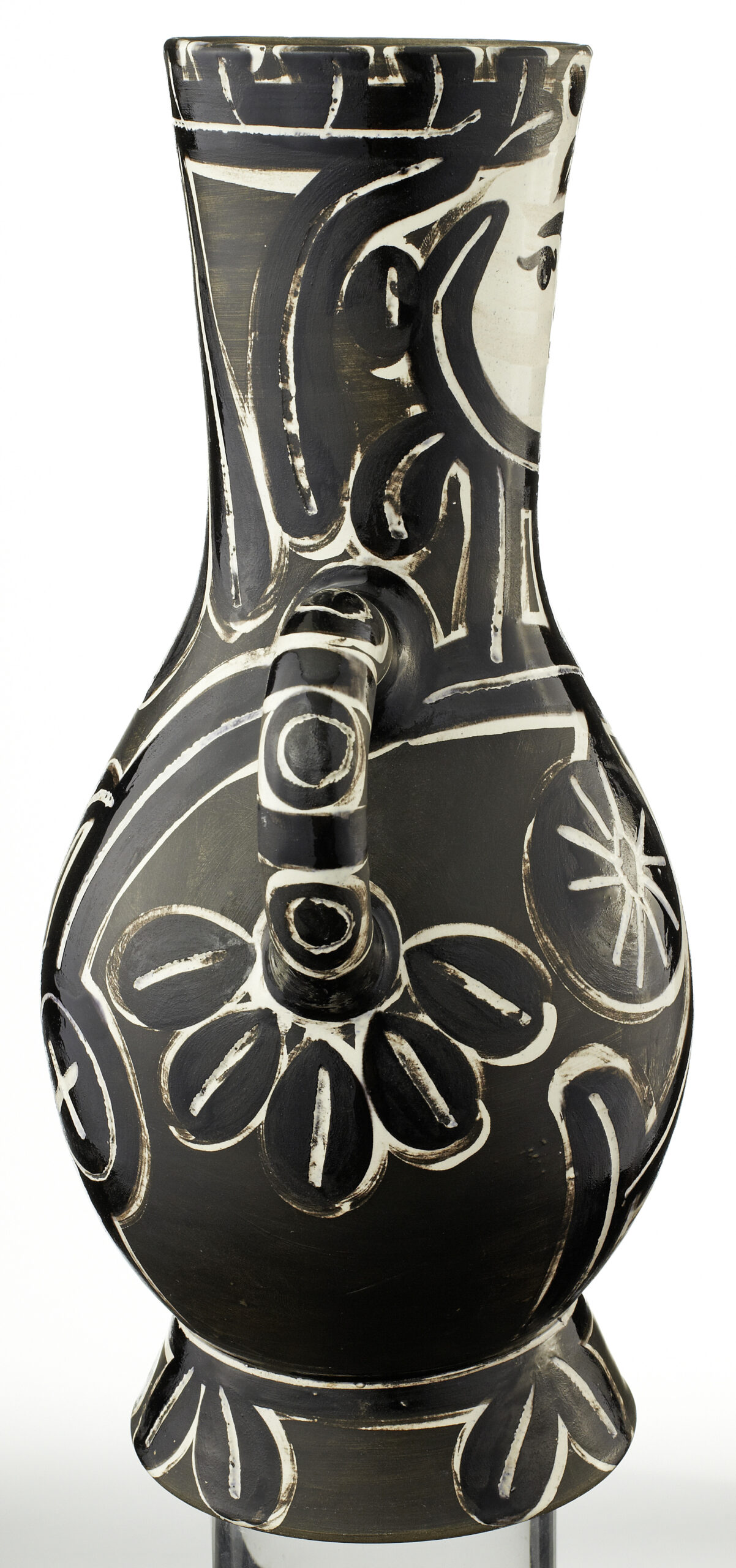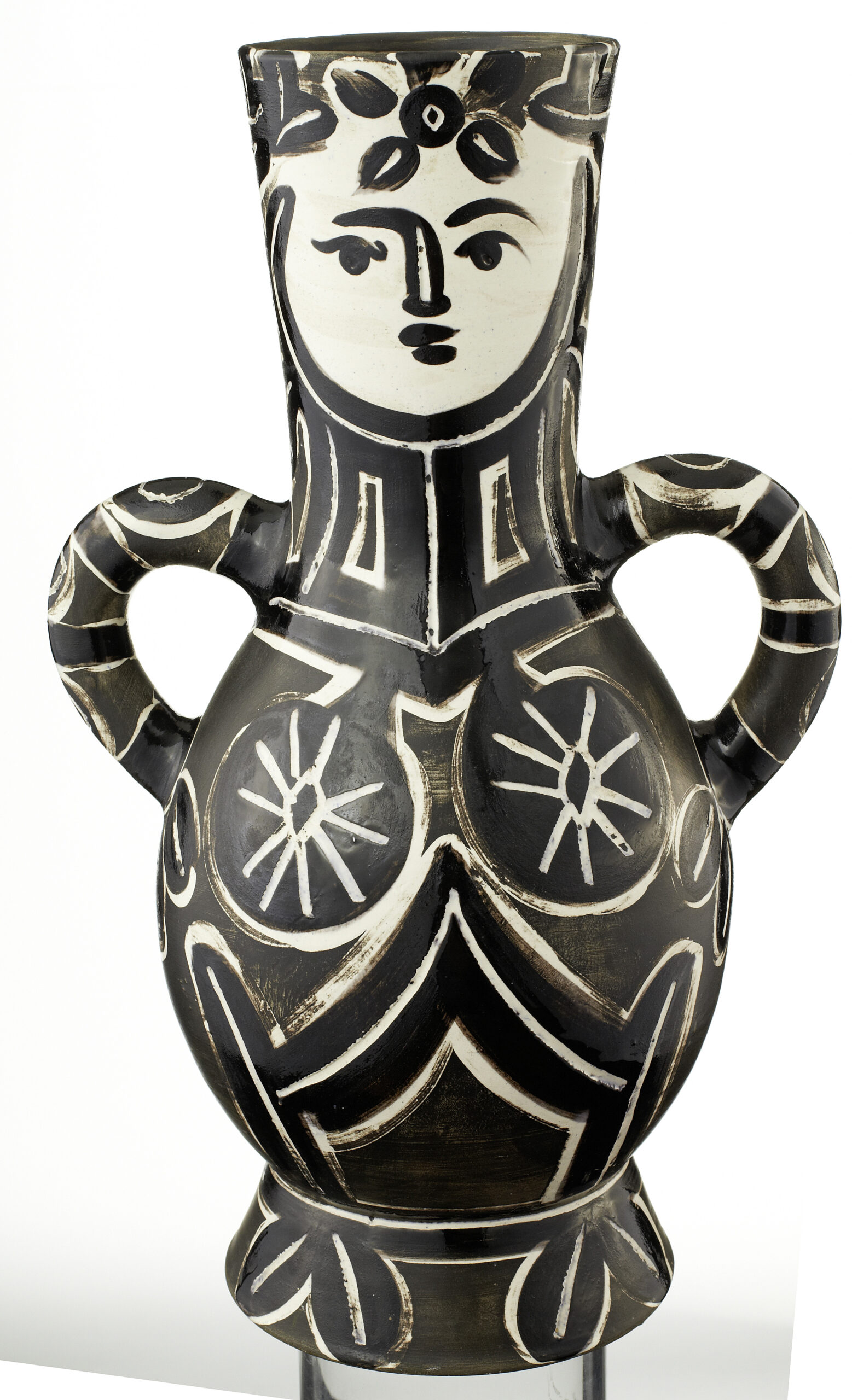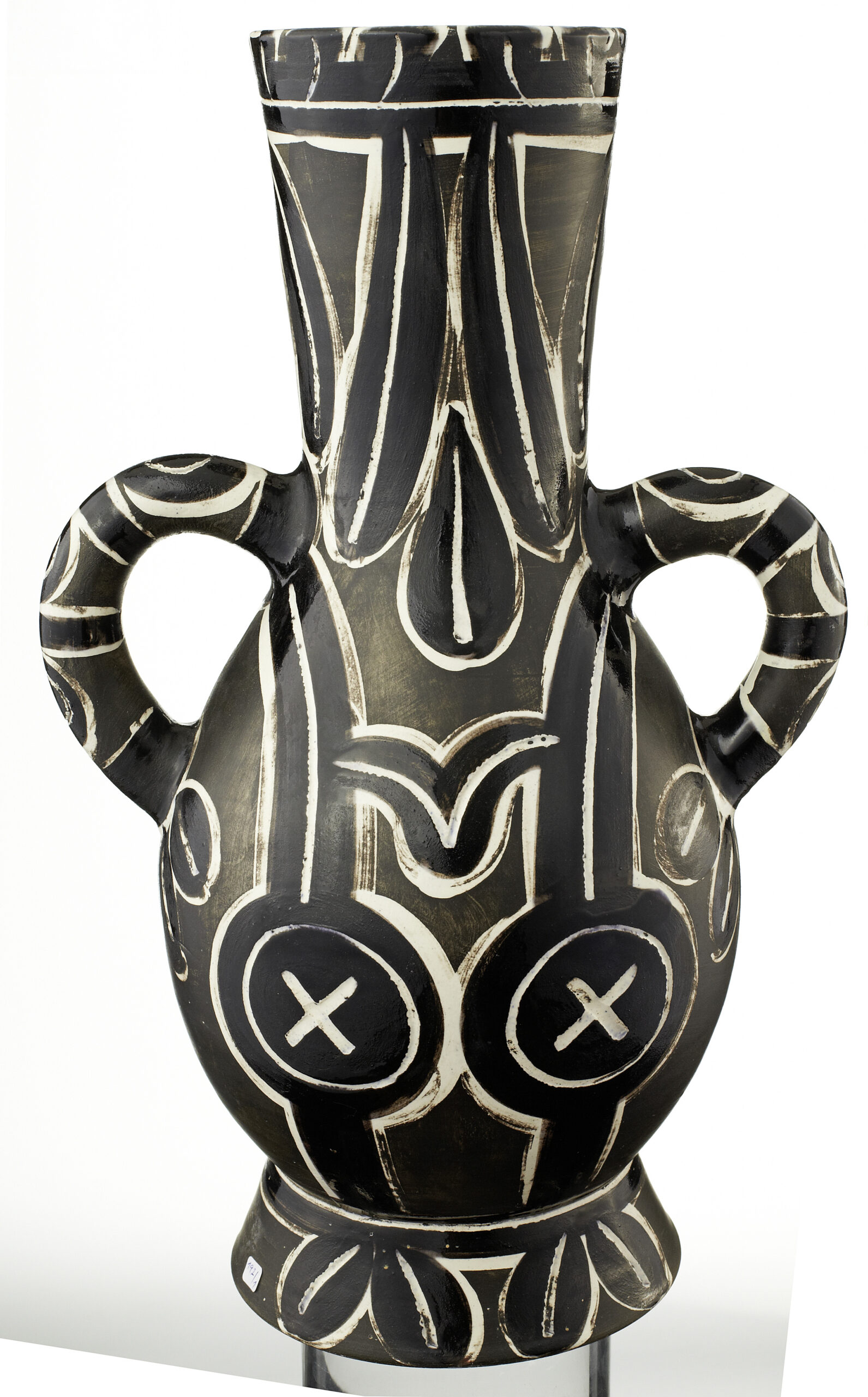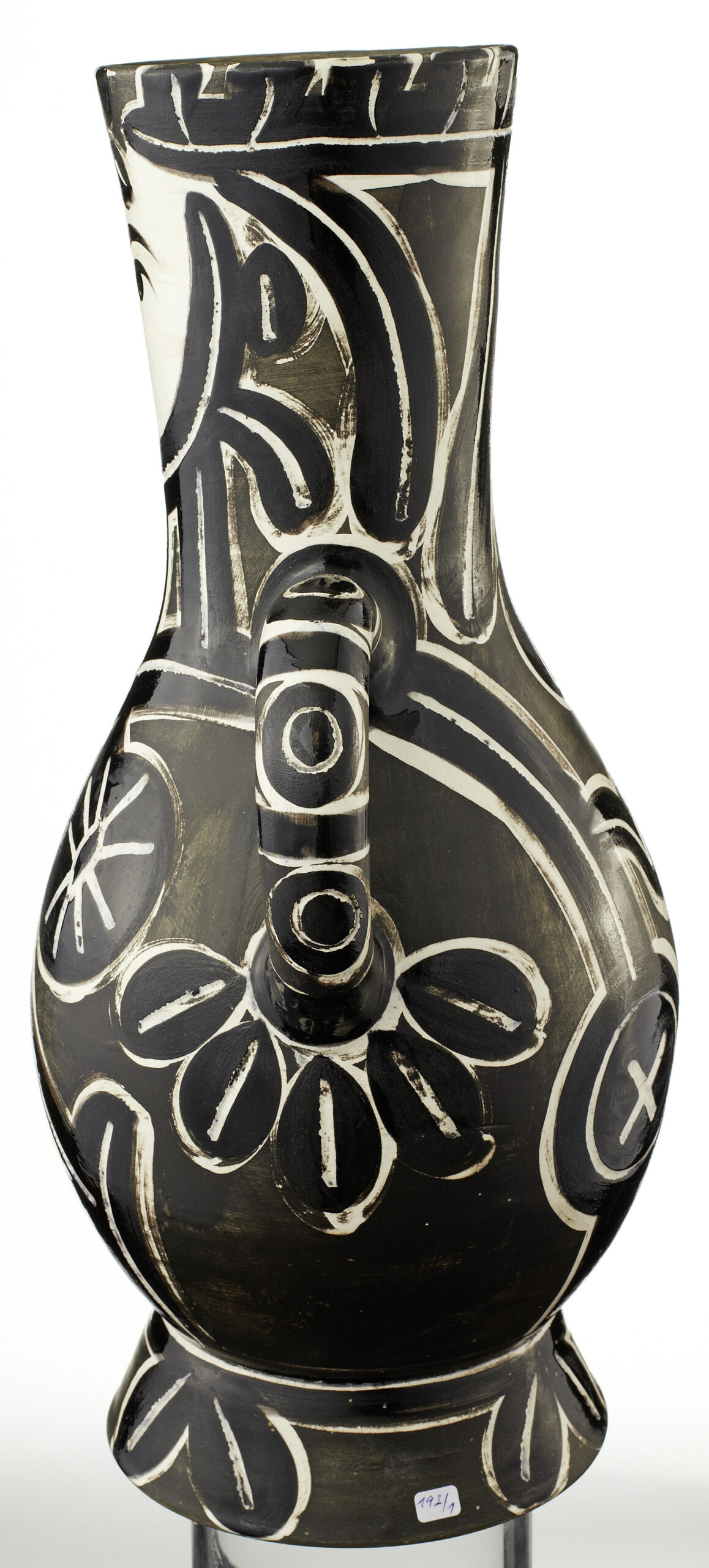 “Vase deux anses hautes”. Keramik, bemalt. Partiell glasiert. Auf der Unterseite Stempel “Madoura plein feu” / “Edition Picasso”. 1952 enstandenes Keramikobjekt. Ramié Nr. 141.