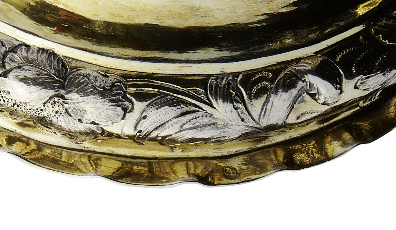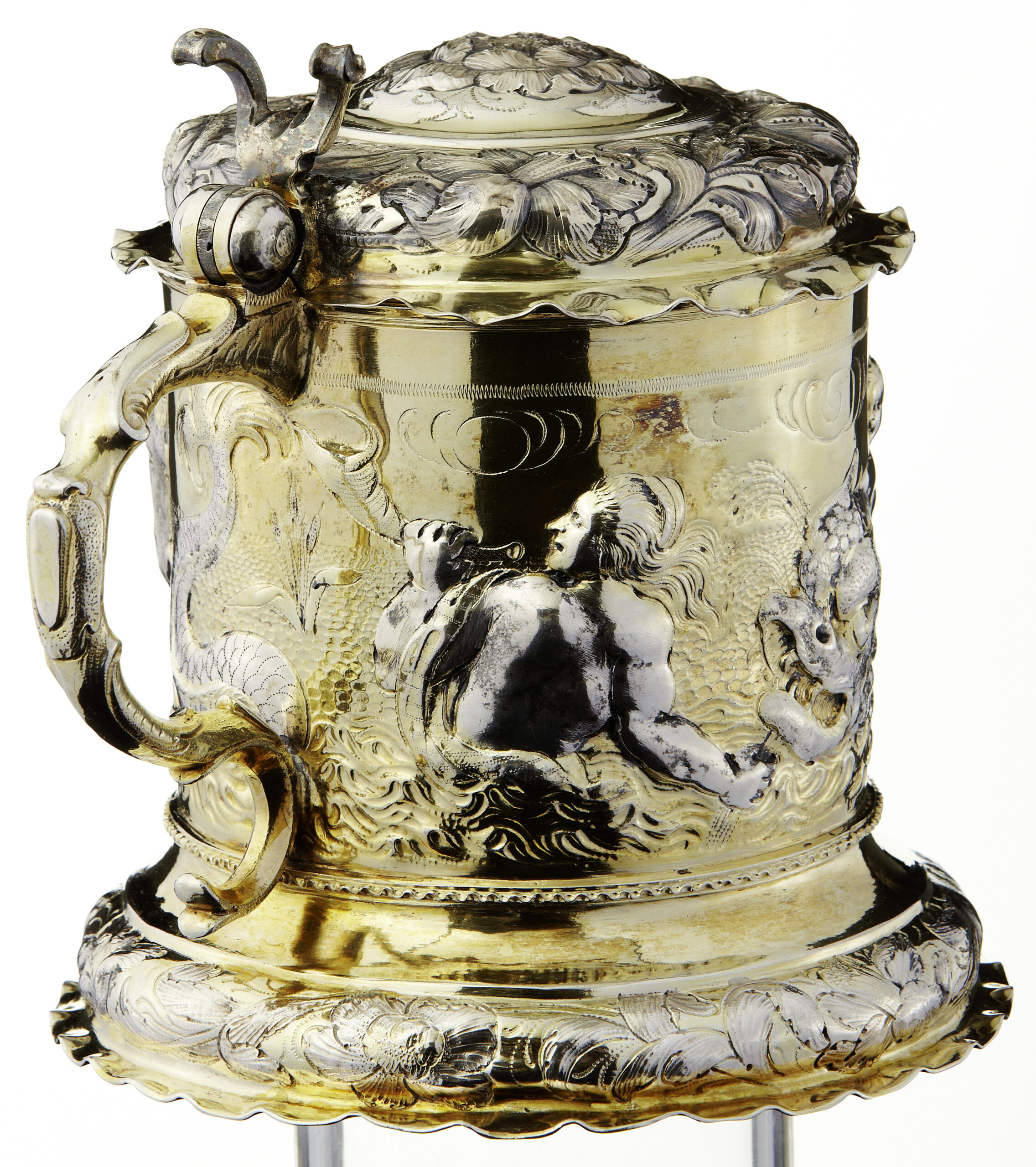 Deutschland um 1680. Meistermarke “CB”. Silber getrieben, gegossen. Auf der Wandung getriebener und fein ziselierter Nereidenzug. Partiell vergoldet. Der Scharnierdeckel und der Fusswulst mit getriebenen und ziselierten Barockblumen. Innen vergoldet. Am Fuss punziert.