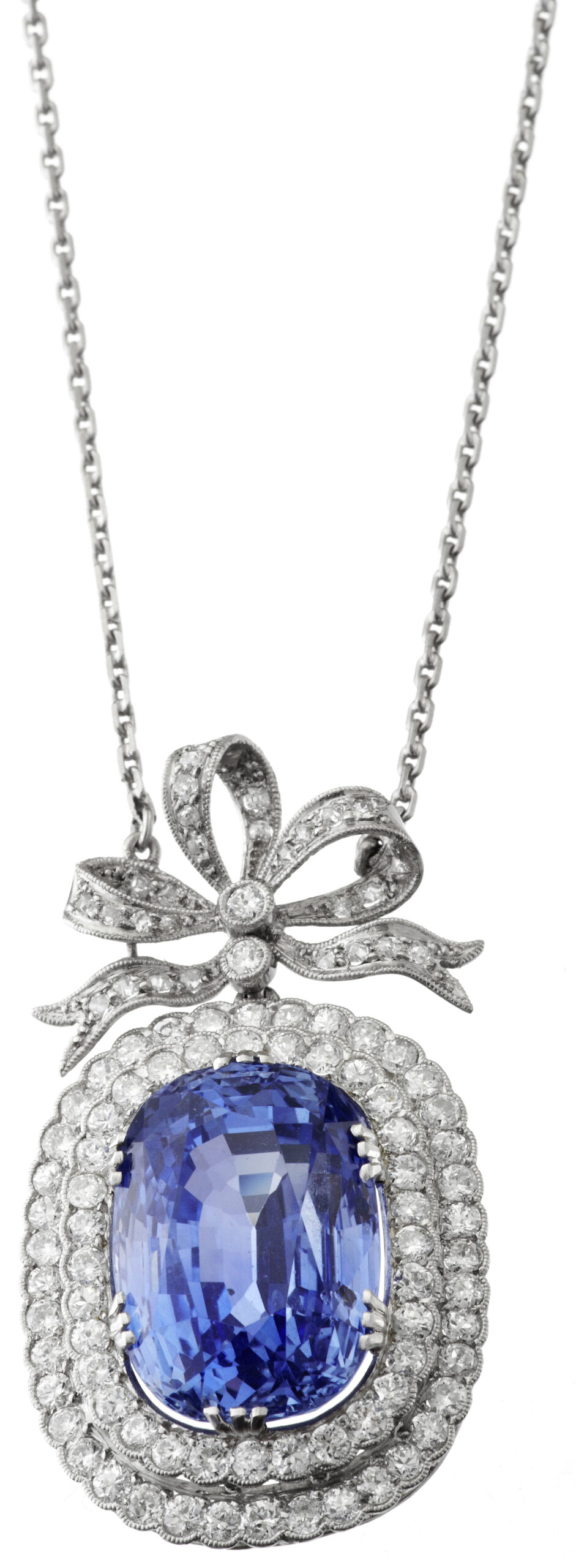 Weissgold 750. Frankreich um 1910. Mit einem antik-oval geschliffenen Ceylon-Saphir von ca. 20 ct. Umgeben von 72 Brillanten von zusammen ca. 1.50 ct. An maschenförmiger Aufhängung mit feiner Ankerkette. Verziert mit weiteren zwei Altschliff-Diamanten und zahlreichen Diamant-Rosen. Länge 45.5 cm. 15.2 g.