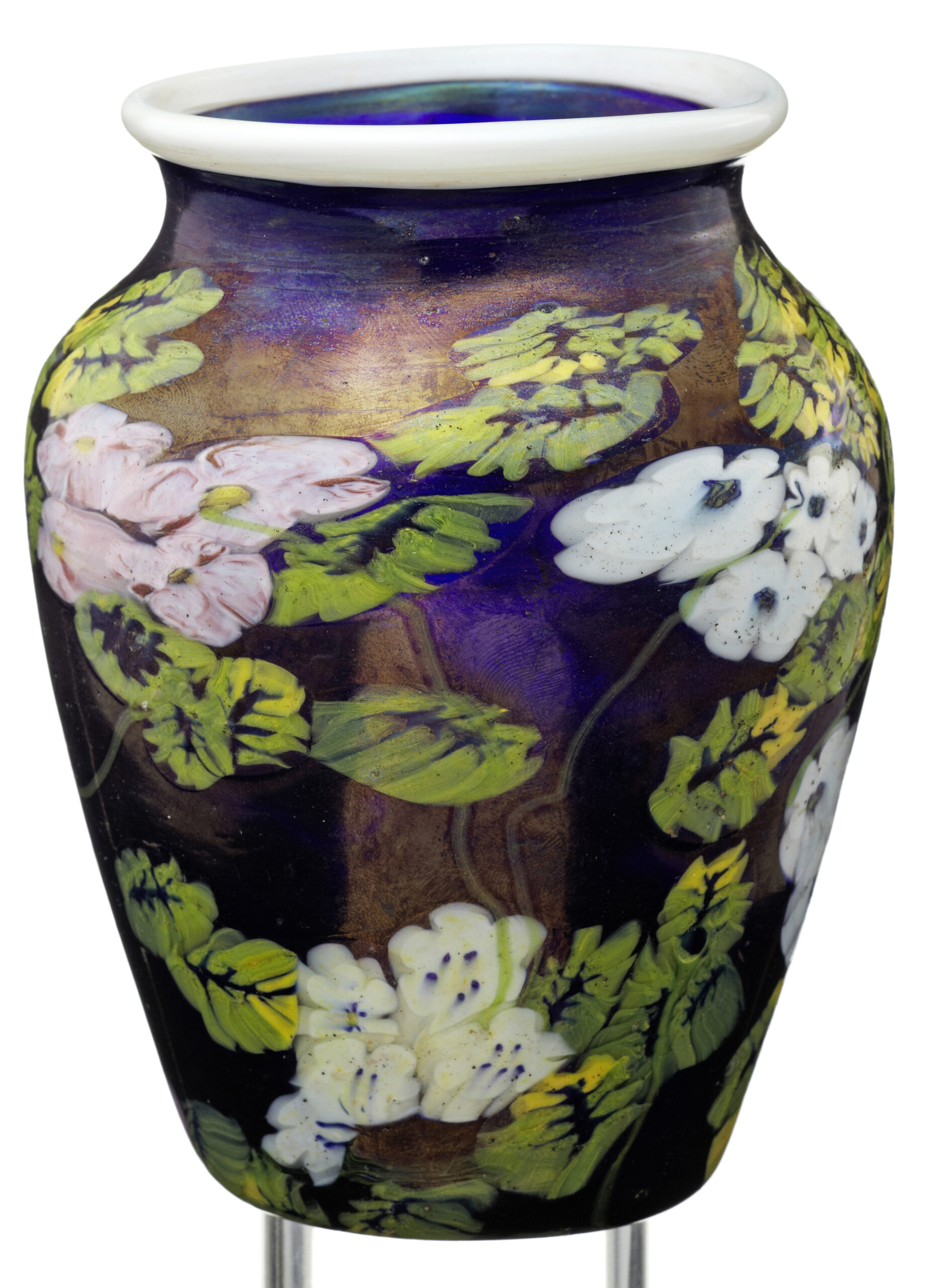 Murano Anfang 20. Jh. Kobaltblaues Glas. Opakweisser Mündungsring. Umlaufender, polychromer Blütendekor in Murrinetechnik. Leicht irisierende Oberfläche. Höhe 14 cm